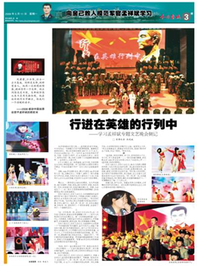 5月9日晚上,由二炮某基地、金华市委、市政府联合主办的以赞颂孟祥斌、学习孟祥斌为主题的专题文艺晚会“行进在英雄行列中”在市人民大会堂隆重举行。