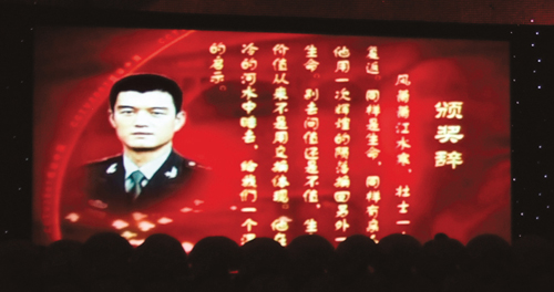 没有人能忘记,没有人会忘记:当城南桥头出现第一个“向英雄致敬”的花圈时,金华市民内心涌起了感动的大潮,他们的灵魂受到洗礼。成千上万的市民走上桥头为英雄守灵,人们用最朴实的方式来告慰英雄。12月4日,三万市民和官兵手持菊花送别英雄。那一时,那一刻,满城菊花香,百姓泪花流,一座城市哭了。“我们要多宣传英雄的事迹,用英雄的事迹激励青少年成长,提高人们的道德素质。”带着40多名学生来观看演出的浙婺艺校老师周跃英说。