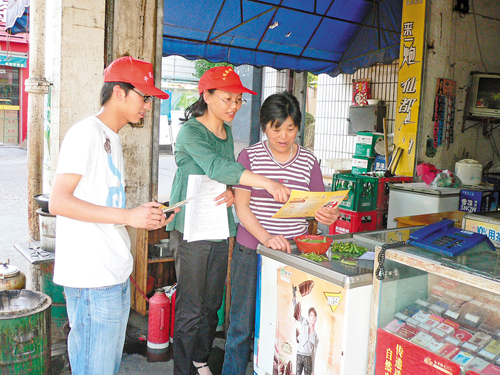 5月8日,城北街道北苑社区的工作人员和志愿者向辖区经营店的业主和普通居民发放健康教育传单,向大家介绍如何合理规范自己的生活习惯等,并提醒大家积极预防甲型流感。记者 吕薇薇 通讯员 汪路 摄