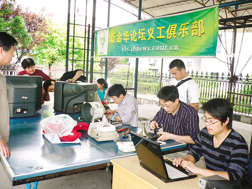 5月17日下午,新金华论坛义工俱乐部一行20余人来到城北街道北苑社区,为居民提供家电维修、水电维修、电脑维修和医疗咨询等服务,并走访慰问了一些残疾困难户,为他们送去米、油等慰问品。 记者 吕薇薇 通讯员 吕桂彦 摄