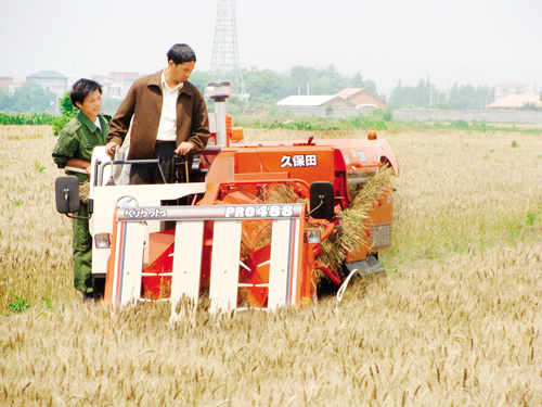昨日,洋埠镇十里坪农场的200多亩麦子开始收割,估计亩产450斤左右。据农场主、全国种粮大户陈建新介绍,今年由于国家的政策好,化肥的价格有所下降,粮价比较稳定,种麦子的收益较好。记者 李 丹 摄