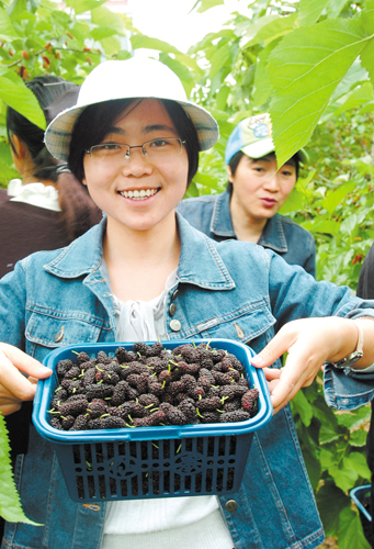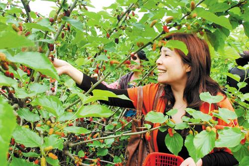这两天,婺城区罗店镇后园村村民张达一家忙坏了,由于今年桑果获得了大丰收,前来他家果园采摘桑果的市民络绎不绝。大家都说,平常工作忙,没有时间来农村走一走,能到果园体验一回做果农的乐趣,是一种特别新奇和开心的享受。有心的张达还事先酿好桑果酒、桑果酱,让市民们带回家品尝。 记者 李忆 摄