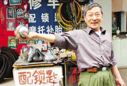 手里托俩铁球,悠闲的转上几转,这本不是什么新鲜的事,可您瞧这位应师傅,他转的铁球可是比人家的大一号,这种实心的大铁球,两个加在一起有4公斤重。应师傅叫应兴邦,今年70岁,在市区恒大街摆修车摊已经12年了。2001年,应师傅查出肩周炎,吃了好长时间的药一直不管用。于是他找来两个铁球,生意空隙的时候转转锻炼身体。刚开始的时候光拿着都费劲,练习了8年,现在他可以自如的转动了。应师傅说,转转铁球是娱乐的一种方式,但是收获最多的还是健康。