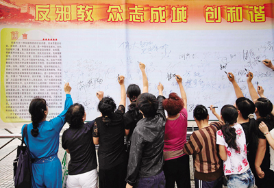 昨天上午,城西街道横街口社区举办了“反邪教众志成,创和谐你我同行”的签字墙万人活动,广大社区居民纷纷来到现场签字。