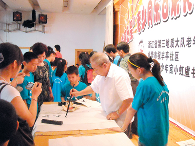 日前,城北街道祝丰亭社区、省地质三大队、青少年宫联合举办了“未来之星”老少同乐百米长卷现场书画联谊活动,社区老年书画爱好者和孩子们同台竞技,现场一派其乐融融的景象。通讯员 李艳春 摄
