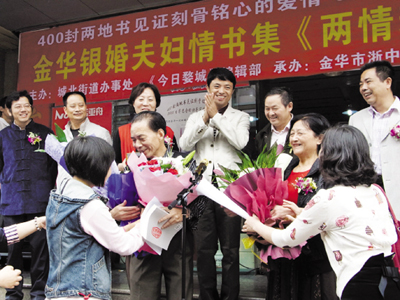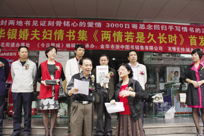 10月2日,由城北街道、《今日婺城》编辑部主办,浙中图书承办的“金华银婚夫妇情书集《两情若是久长时》首发式”在市区解放东路浙中图书门前举行。情书集作者李元、罗碧华伉俪相濡以沫,历经磨难,却历久弥新的爱情深深打动了在场的所有人。