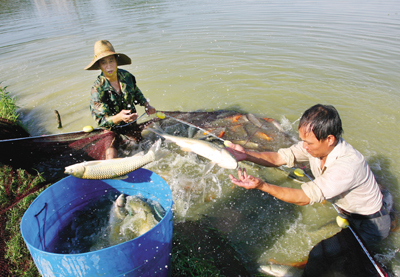 “养鱼还是很辛苦的。”唐根南擦了把汗,直起身说,“每天都要巡塘,看看鱼塘有没有缺口,看看鱼有没有浮上来,那说明它们缺氧了。”喂养、打捞、换水、运输,一系列的工作主要都由年过半百的唐根南夫妇完成,“特别忙的时候再请七八个人帮帮忙。”