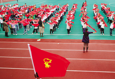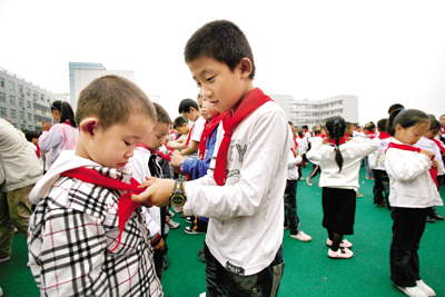 昨天下午,婺城小学举行了以“争当四好少年,争做阳光儿童”为主题,庆祝中国少年先锋队建队61周年暨新队员入队仪式。在雄壮的《中国少年先锋队队歌》声中,刚入学的一年级小朋友接受了高年级大哥哥、大姐姐们为他们佩戴的鲜艳红领巾,意味着他们光荣地加入中国少年先锋队,成为一名少先队员。佩戴仪式结束之后,同学们在大队辅导员的带领下举起右手进行了庄严的宣誓活动。记者 方晟 摄