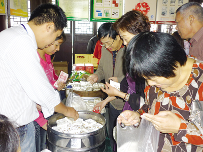 在揽秀阁二楼展厅,安地镇项村的“阁香桂花糕”展台前成了最热闹的地方,桂花糕成了参观者的抢手货,不少人在品尝后不忘买些回去馈赠亲朋好友。项村大学生“村官”金建成在展台前卖力地吆喝。“这些桂花糕采用传统工艺制作,甜而不腻,清香可口,吃一口嘴角都留有淡淡的桂花清香。”金建成介绍起桂花糕的特色,说得头头是道。短短的两个多小时,就卖出了价值600多元的糕点。“按这样的销售形势,估计今天营业额能达到3000元。”金建成说。该镇的奔月桂花专业合作社推出的桂花酒,在展会上也备受关注,前来品酒的人甚多。合作社负责人鲍维告诉记者,该合作社是安地较早进行桂花产品深加工的企业,所产的桂花酒主要定点供应,按照目前的生产能力还不能满足市场的需求。此次先在展会上“亮亮相”,等条件成熟后再广泛面向市场推出。