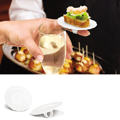 在参加宴会的时候,其实最麻烦的,莫过于站着与人聊天的时候,同时还要拿着饮料与点心,真是令人手忙脚乱。现在,有了这个指盘(FINGERFOOD),你只要一只手,就可以将饮料与点心带着走,真是有创意。只是,这个指盘一次只能拿一个点心,好像不太够喔。