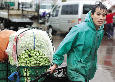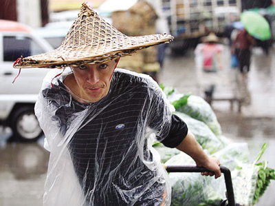10月23日,一批工人在福建厦门市高崎蔬菜批发市场顶着风雨装运蔬菜。当日12时55分,今年第13号强台风“鲇鱼”在福建省漳浦县沿海登陆,给厦门市带来狂风大雨。目前厦门有关部门正积极组织蔬菜货源,保证居民日常生活。(摘自新华网)