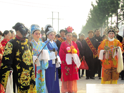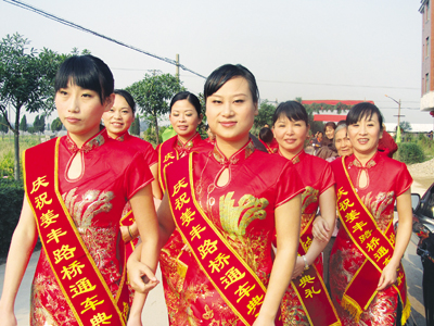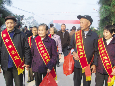 本报讯(记者 月映红 通讯员 黄震 姜笑庆)昨天早上8时,白龙桥镇姜丰村的村民敲锣打鼓、喜放鞭炮,庆祝盼望了几十年的联村公路建成通车,村民们各个喜上眉梢,尤其是村上4对80岁以上的老夫妻,他们用自己的方式欢迎参加仪式的来宾们。该村主任李林说:“姜丰到雅绕的联村公路通车以后,村民们不仅进城方便多了,而且为村民打通了致富之路。”