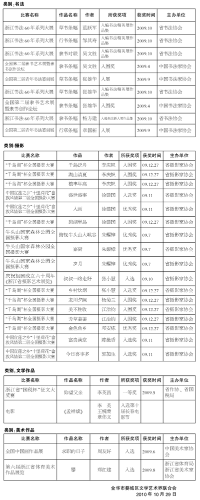 婺城区文学艺术界联合会(文联系统)2009年度协会会员省级以上获奖、入展情况公示