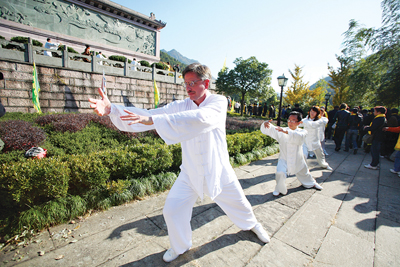 11月11日,在首届金华山黄大仙文化节开幕现场,表演太极功夫的200多名太极拳爱好者中,一老外特别引人注目。据介绍,他叫保罗,来自美国,现在金华工作。由于非常喜爱中国传统文化,保罗迷恋上了太极拳,目前学习太极拳已有四、五个月了。记者 方晟 摄