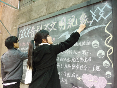 城西街道双龙大桥社区一期以“崇尚文明 摒弃陋习”为主题的黑板报,引得很多居民驻足围观。据悉,自金华市评选出“十大不文明行为”后,大学生志愿者们就来到双龙大桥社区,利用宣传栏、黑板报等阵地,倡导文明新风,营造纠治“不文明行为”的良好氛围。