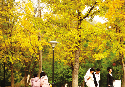昨日,记者在市区的公园和道路两旁看到,银杏树、梧桐树叶纷纷披上“金甲”,泛黄的树叶也飘落铺满地面,为冬日的婺城增添美景。