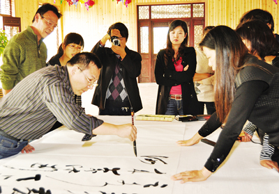 昨天,著名书法家张雄华、著名画家吴广明领衔的“滴水客水墨工作室”、“雄华书法艺术工作室”众多书画爱好者相聚在绿水湾农庄,一起切磋和展示书法艺术。据了解,这是区文联开展文艺进基层工作的一项活动。区委常委、宣传部长傅关福出席了联谊活动。詹天 于兴勇 摄