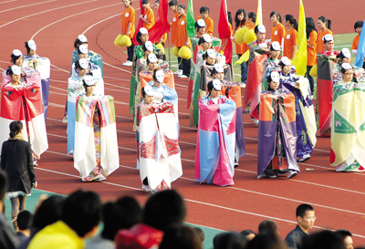 昨天上午,在金职院大操场,艺术学院的学生展示自我设计的服装秀,取材于婺剧戏服的传统文化元素,让人眼前一亮。学生们展示所学,张扬青春的个性:服装秀、礼仪展示、插花表演、团体操……各具特色。