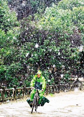 昨天,地处南部山区的塔石乡下起了鹅毛大雪,该乡邮政所工作人员郑文清,像往常一样8:30准时上班。虽然下着大雪,但郑文清依然要骑行40多公里的山路,为5个村投递邮件。记者 方晟 通讯员 傅卫明 摄