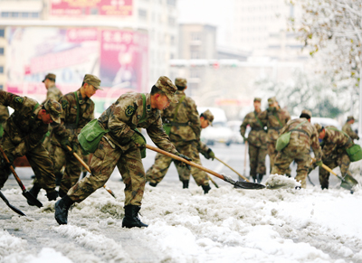 昨日一大早,驻金官兵纷纷走上街头,清扫积雪。记者 方晟 摄
