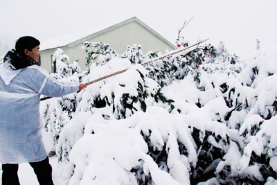 12月15日的大暴雪给汤溪镇以蔬菜生产为主的设施农业,造成前所未有的“压力”,不少蔬菜大棚遭到不同程度损失。昨天下午5时许,记者在九峰职校农业基地看到,基地里钢架结构的大棚已被积雪压弯。 基地工人正在清扫薄膜积雪,对蔬菜大棚开展自救。 记者 李丹 摄