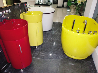在金华浙中建材市场陶瓷卫浴区,绿色马桶、红色浴柜、金色浴缸、花卉面盆吸引了众多消费者的关注,销售员王女士说:“对时尚人士来说,卫浴也是一个产生梦幻的地方,白色不再是唯一选择,缤纷色彩的点缀更能带来自然气息。无论是洗澡的浴缸,还是洗手的面盆,都开始变得花哨。一款色彩鲜艳的浴室柜,可以让浴室顿时充满活力,让淋浴更畅快自在。”
