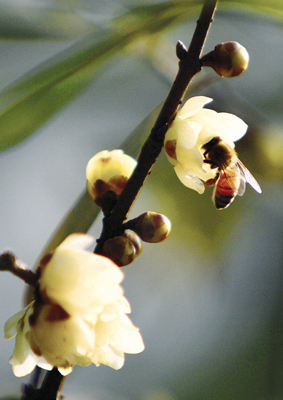 梅花香自苦寒来。昨天下午,记者在市区清风公园里看到,腊梅花已悄然开放,树上花蕾满枝,玲珑剔透,花香清醇飘逸,引得小蜜蜂扑翅而来。