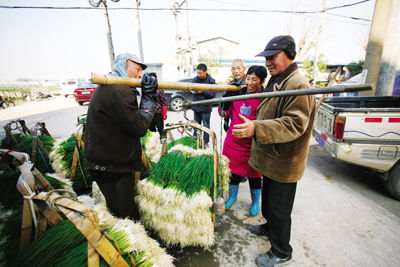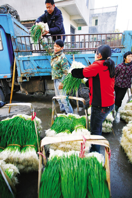 昨天,记者在乾西乡联合社区的香葱合作社门口看到,一辆大卡车正停着收购香葱,村民一担担地把整理、清洗好的香葱往车上装。乾西联合的香葱目前已经是“香”飘省内外,特别是杭州、衢州等地的商家,直接到这里来收购。据了解,今年联合的香葱产量不错,但价钱跟上半年相比有所回落。 方 晟 胡甦窕 摄