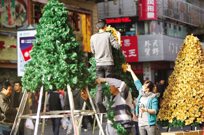 离圣诞节还有半个多月的时间,金华街头的圣诞氛围已开始渐渐浓厚,市区各大商家纷纷以圣诞节的名义,早早地在门口布置圣诞主题的摆设。
