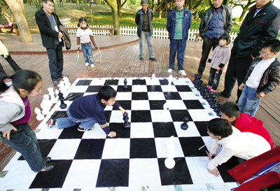 12月5日下午,记者在市区婺州公园里看到,金华江北棋院的老师带着一群小棋手在训练国际象棋。只见小棋手们在一张3米乘3米的大棋谱两侧,聚精会神,“调兵遣将”,和对手展开角逐。一瞬间,棋盘化为血雨腥风的战场,国王、皇后、城堡、主教、骑士、兵卒在“沙场”上奋勇厮杀……精彩的对决吸引了路人驻足观看。