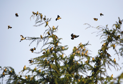 近日,随着气温下降,数千只南下越冬椋鸟迁徙至金华, 飞聚在婺州公园树林上空,形成一个蔚为壮观的独特景观。据公园管理员介绍,每年入冬,都会出现成群椋鸟在公园汇聚的情景。因公园内种有大面积的樟树、杉树、冬青树等树种,为椋鸟提供食物来源。它们白天觅食,傍晚汇聚在树上休息。记者 方晟 摄
