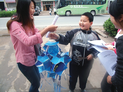 自行车小模型、多功能收纳盒、简易环保笔筒、创意环保袋低碳……其中最吸引眼球的就是用废弃海宝稍作裁剪制作的“六六大顺灯笼”。5月9日,浙江师范大学经济与管理学院087班的志愿者带着他们用废旧物品制作的环保小作品来到城北街道军民社区,向居民们介绍简单易行的节能窍门,用实际行动宣传、践行低碳生活理念。