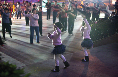 每到夜晚,金发广场上都热闹非凡,大家聚在一起开心地跳舞,一对双胞胎小姐妹有模有样地跟着节拍开心地摇摆着,像似在给大家领舞。