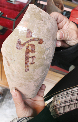 日前,记者在收藏家吕学姜先生家中看到一个残破的陶瓶,鼓腹细足,典型的宋代酒瓶式样。陶瓶的瓶口部分已经残缺,但是青白色的釉面依然光亮。最吸引人的是瓶腹的那一个深红色的“官”字。“从酒瓶的形状、烧制方式和‘官’字的字体,可以确定这个酒瓶是宋代的。”吕学姜介绍,“这是市区首次发现的宋代‘官’字酒瓶,印证了史料上对宋代金华酒业辉煌历史的记载。”