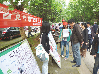 5月15日上午,城北街道祝丰亭社区工作人员和浙江师范大学的志愿者联合开展了 “防灾抗震”平安知识宣传活动。反映地震常识、地震救援、夏日游泳须知、火灾自救、溺水自救等内容的展板,吸引了过往市民驻足观看。 通讯员 李艳春 摄