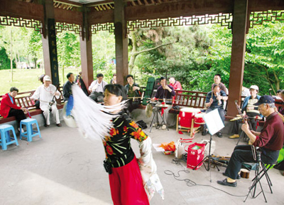 在市区婺州公园的双溪阁里,有一群婺剧“票友”时常聚集在一起唱戏表演,动听的婺剧吸引了不少群众围观欣赏。