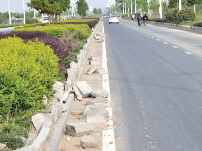 4月29日,记者途经白龙桥镇临江东路时看到,原先砌在路中间绿化带边上的装饰石已有近30米脱落。附近村民说,这些装饰石散落在路中已有一段时间,不但影响美观,还存在安全隐患,大家都希望有关部门能及时派人修复。