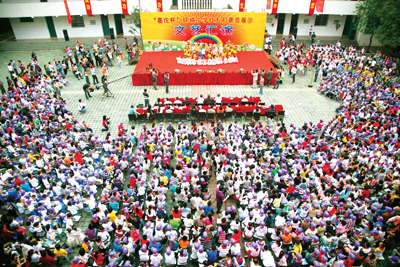 5月19日上午,环城小学校园内一派喜气洋洋的景象。走进校园,两边是五彩缤纷的伞画世界,伞面上画满了学生创作的精美图案;大厅里展出了大型绘画展板,这些壁画和剪纸都是由学生合作创作的,展示了我国民族文化的博大精深,反映了人与自然和谐共处的理念;中操场上放飞着4个火红的气球,搭起了大型舞台。原来,历时一个月的“红五月”素质教育展示活动即将胜利闭幕。