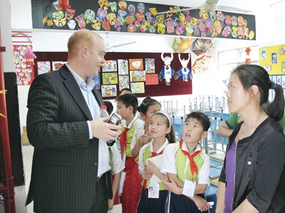近日,在英国大使馆文化教育处官员杜伟的陪同下,英国诺丁汉郡校长团一行3人来到北苑小学进行“校际连结”交流活动。