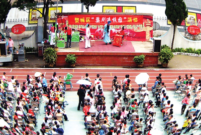 5月21日,金华市青年婺剧团的演员们来到红湖路小学,开展“婺剧进校园”活动,红湖路小学500多名师生观看了《雪里梅》、《樊梨花巡关》、《牡丹对课》等婺剧曲目。演员们精湛的表演博得了师生们的阵阵掌声。