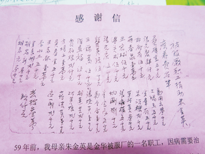 “这份情,等以后有条件了,一定要还上。”1958年,病危的朱金英把时年15岁的儿子王森章叫到床前,将一份抄录着捐款人的名单和自己的未了心愿托付给儿子,