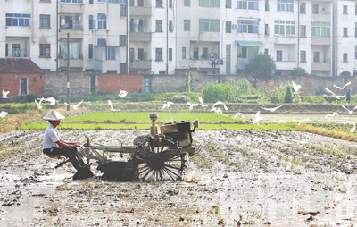 日前,记者途经汤溪镇汤溪村时,看到一群白鹭正围着耕田的农民上下翻飞,自由觅食。田野、耕夫、白鹭,组成了一幅人与自然和谐的乡村美景。