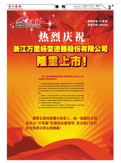 浙江万里扬变速器股份有限公司股票挂牌上市仪式今日在深圳证券交易所隆重举行。