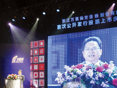 徐止平在上市仪式上讲话。他首先代表市委、市政府,向万里扬的成功上市致以最热烈的祝贺。他说,万里扬公司的成功上市,实现了由小到大、由弱变强跨越式,乃至超越式发展,得益于一直把科技创新作为企业可持续发展的根本,走出了一条独具特色的企业发展之路,不仅促进了金华市的经济发展,更为我市培养了大量的技术人才,为我市的建设与发展做出了杰出的贡献。他指出,万里扬股票的发行上市,标示着金华又一家优秀企业进入国内资本市场,实现了产业资本与金融资本的有机结合,不仅为企业发展增添了强大动力,也为金华企业创新发展理念、创新组织形式、创新融资渠道起到很好的示范作用。黄河清表示,今后将积极通过借力于资本市场,不断扩大产能和推出新产品,全面布局商用车变速器市场。
