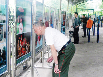 6月18日,城北街道北苑社区健身园内开展非物质文化遗产展板进社区展示活动。展板内容精彩纷呈,民俗文艺、剪纸等内容都有千百年的历史,让居民大饱了眼福。通讯员 吕桂彦 摄