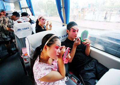 6月21日,婺城区婺剧促进会赴东阳开展交流演出活动。天空还算作美,晚上6点开始,大雨渐止,时不时的毛毛细雨并没有影响到大家的兴致。化妆、搭台、布置,40多名演职人员各司其职,紧张而有序地进行着演出前的准备工作。“这是我们第一次到东阳演出,一定要拿出最好的状态来。”白龙桥青年婺剧团团长倪秋花对所有的演员说。