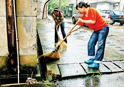 昨天中午,在市区五一路原长运公司宿舍楼下,新党员戴莹和热心居民一起,疏通下水管道,清扫宿舍楼下的积水和淤泥,以方便住户进出。据悉,连续不断的强降雨,不仅使人出行不便,也造成了一些老房子的渗漏问题。因此,凤凰山社区在册党员当天还分别前往老年住户家中,帮助维修渗漏的屋顶,受到了居民赞赏。方晟 吴潮宏 摄