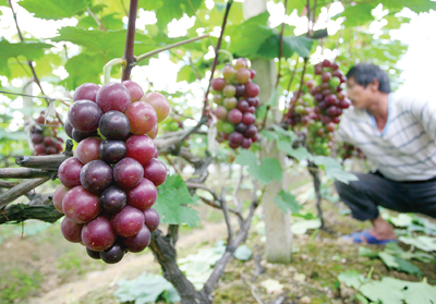 昨天,记者在蒋堂镇下尹村的大棚葡萄基地看到,紫红色的藤稔葡萄一串串挂在枝上,十分惹人喜爱。种植户郑云法介绍,大棚葡萄比普通的葡萄上市时间要早上十多天,虽然今年由于天气关系,上市时间会推迟一些,但只要天气放晴,马上可以上市。