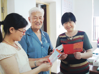 为迎接即将到来的“七一”建党节,从6月21日开始,八咏楼社区党委就陆续向辖区内的在册党员们送上由社区干部精心设计制作的精美贺卡,希望他们时刻牢记自己是一名共产党员,遵守党的宗旨,坚定党的信念,在“创先争优”活动中发挥党员模范带头作用。