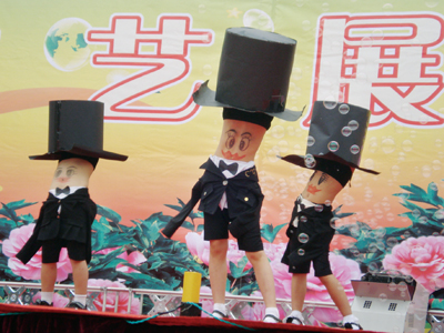 你看,孩子们身着美丽的服装翩翩起舞,像极了美丽的茶花仙子;两位小朋友演起了双簧,一个说一个演,夸赞竹马美、茶花香;一曲用古筝弹奏的《山茶花》引得大家侧耳倾听……而最吸引人眼球的莫过于小朋友们自创的舞蹈《肚皮娃娃》。黑色礼帽把演员们的头都遮住了,只露出画了笑脸的肚皮,腰上挂着小礼服,整个造型看上去就像是大头娃娃在跳舞,十分滑稽可爱。现场掌声不时响起。